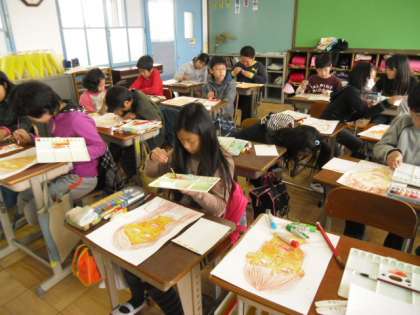 2組は,自分の顔を描いていました。絵の具で微妙な顔の色を表現していました。そういえば似てるかも。