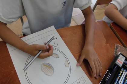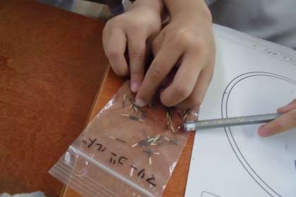 生活科の学習で、花の種を観察しました。朝顔の種を観察したときのことを思い出して、上手に観察していました。「〜みたい」と、例えて書く子がたくさんいました。