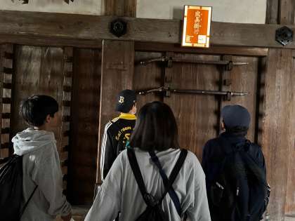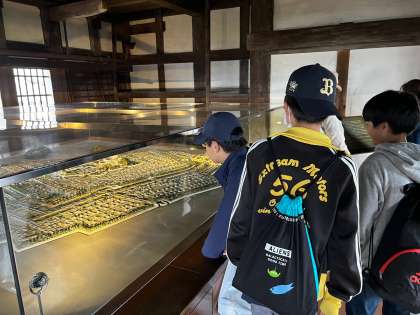 天守閣の中にグループごとで入りました。階段は急で上る時も降りる時も大変でした。一番上が6階で、途中の階では展示や説明があり、学びながら天守閣に向かいました。