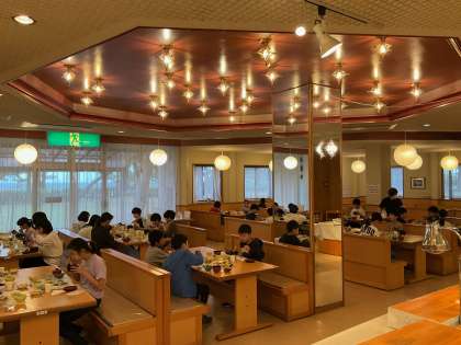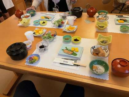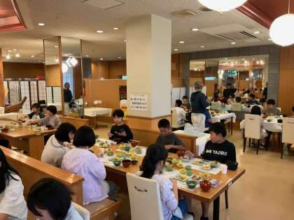6時30分に起床し、7時から朝食です。少し眠たそうな子も朝から元気な子も、みんなそろってたくさんの食事をいただきました。今日も子どもたちは元気です。