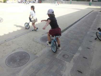 放課後の運動場を見てみると、一輪車を練習する子どもたちの姿が!壁を支えに練習しているうちに、気付けば手を離して走れるようになった子もいました。