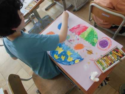 図工の「ふしぎなたまご」で、前回作ったたまごを割って作品を仕上げました。