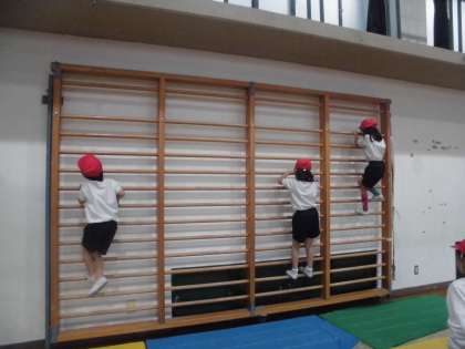 体育科「ゆうぐあそび」の学習で、肋木と平均台の使い方を学習しました。肋木を上ると、思ったより高くてびっくりしている子もいました。安全に遊ぶことができました。