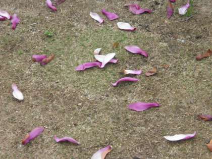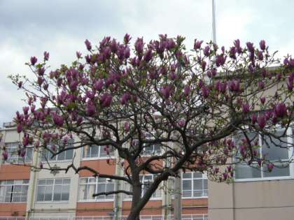 桜が散ったあと,たくさんの赤い灯りがともったように咲いていたモクレンの花が,今日の雨で随分散ってしまいました。