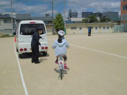 一人2回ずつコースを回り、安全な自転車の乗り方について学びました。最後に実際におきた自転車の事故についてお話を聞きました。今日の学習を生かして今まで以上に安全に気を付けて自転車に乗ってほしいと思います。