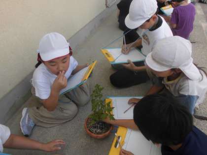 葉っぱの形やさわった感触、においなど、観察して気付いたことを観察カードに書いていました。観察しているときには、「トマトのにおいがする!」「葉っぱを触ったらザラザラしている」といった声も聞こえてきました。