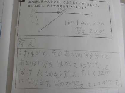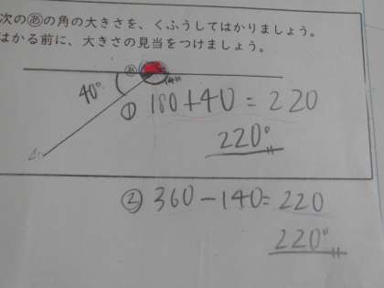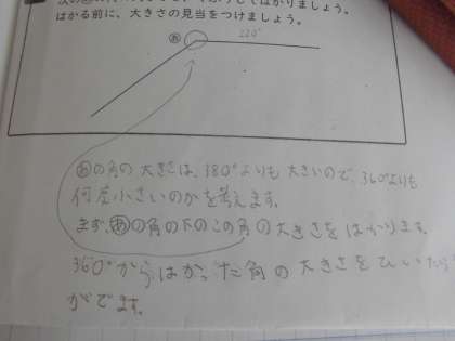 角とその大きさ 公開日 2024/06/10 更新日 2024/06/10 4年担任から 算数の学習は分度器を使って角の大きさを計る学習を進めています。今日は180度を超える大きさの角のはかり方を考えました。180度をもとにして付け足して求める方法や、360度をもとにして引いて求める方法など、2つの方法を学習しました。