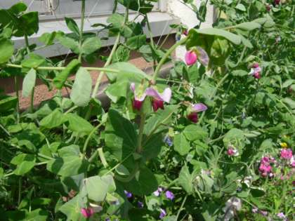 ツタンカーメンの豆の花が一斉に咲き始めました。紫色のかわいい花です。