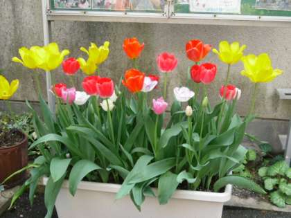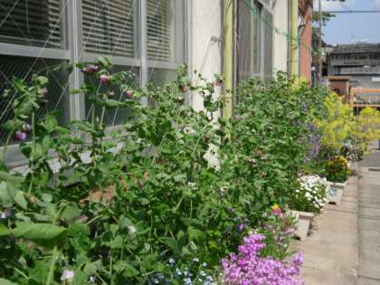 1月14日に種まきをして3か月。蔓も随分伸び,緑のカーテンになりつつあります。春の花壇を華やかに彩ったチューリップもそろそろ終わりを迎え,次の主役はツタンカーメンの緑のカーテンに移っていきます。