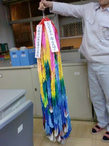 6年生は4月26日〜27日の修学旅行で,兵庫県の淡路島にある「北淡震災記念公園 野島断層保存館」に行きます。この施設は1995年に起こった阪神淡路大震災でできた野島断層が保存されていたり,大震災の記録が残されているところです。この施設に隣接して,震災で亡くなられた方々の慰霊碑があり,亡くなられた方への祈りを込めて千羽鶴が捧げられています。朱雀第七小学校でも千羽鶴をささげようと,6年生だけでなく,全校に呼びかけて,その趣旨を説明して,折り鶴を折ってもらいました。どの学年も協力してくださり,1486羽の千羽鶴を作ることができました。