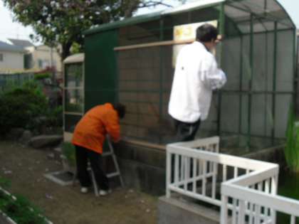 チョコの小屋の風よけも,もう必要ありません。前田先生と管理用務員の細川さんが,小屋を覆っていたビニールをはずしました。チョコも暖かな春の空気を体いっぱいに感じたことでしょう。よかったね,チョコ。