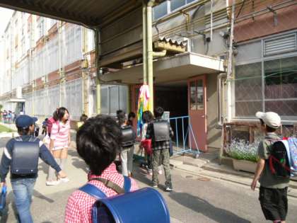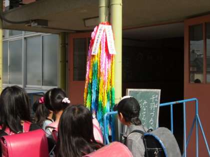 6年生が呼びかけて,全校の子どもたちが折った千羽鶴が出来上がり,今朝,北校舎の入り口に飾られました。登校してきた子どもたちはみんな足を止めて立派な千羽鶴を見上げていました。