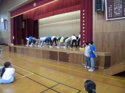 今日は朝会で第1回児童集会のお知らせを全校に伝えました。