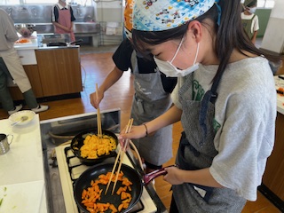 【6年】家庭科 調理実習 公開日 2024/07/05 更新日 2024/07/05 6年担任から 今日は2組が、家庭科「朝食から健康な1日の生活を」の学習で調理実習を行いました。 彩り炒めとスクランブルエッグの2品作りました。炒める準備を工夫したり、野菜の切り方を工夫したり。考えながら、取り組むことができました。