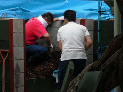 5月3日(木),2時過ぎ。中京区のエコまちステーションの方が,堆肥の整備をしに来てくださいました。早くよい堆肥ができるようにと,堆肥になりにくい木の枝などを除いて場所の入れ替えをしてくださいました。