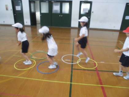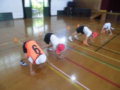 グループで列になって、いろいろな場所を先頭の人のまねをしながら回りました。ゴムを飛び越えたり、ミニコーンの間をぐねぐね走ったりと、それぞれのグループでまねをし合って楽しんでいました。