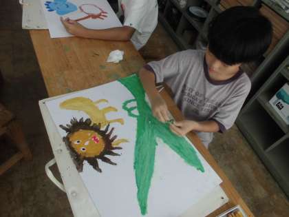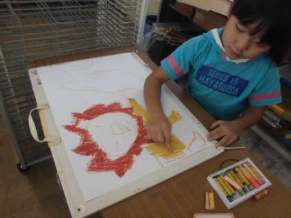 先週から下書きをして、今週はクレパスやコンテを使って色塗りをしはじめた子もいました。子どもたち一人ひとりの個性があふれる作品が完成しそうです。