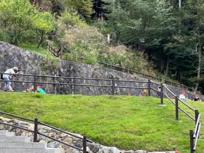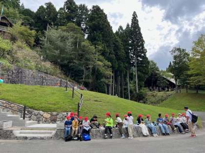 芝生の近くでお弁当を食べています。予定より早く進んでいるので、この後のフライングディスクゴルフの時間をたくさん取れそうです。