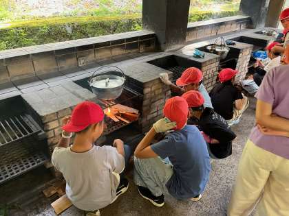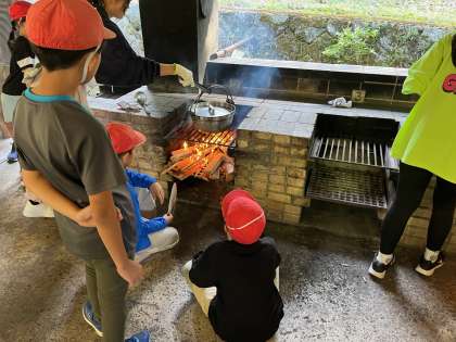 かまどの薪に火がつき、野菜の入った鍋を温めています。火をつけるのに苦労している班もあります。