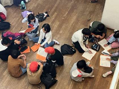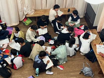 班で今日1日のふりかえりをしています。今日の活動を振り返り、明日の活動も協力していきます。