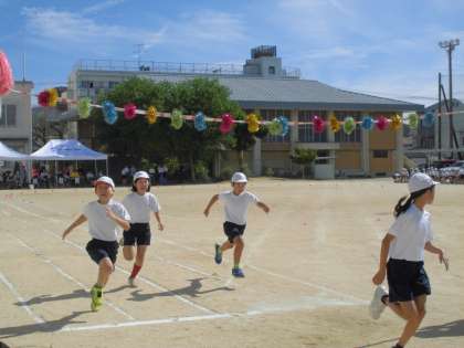 個人種目の徒競走は100メートルを走りました。昨年よりも距離が延びましたが、ゴール目指して力いっぱい走りました。コーナーでもスピードを落とさずに走りました。