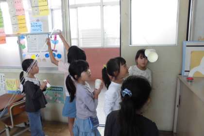 図画工作科の学習で「スルスルビューン」に取り組みました。材料の用意等ありがとうございました。友達と話をしたり、試したりしながら、楽しく取り組んでいました。