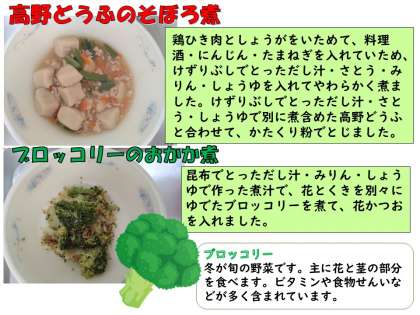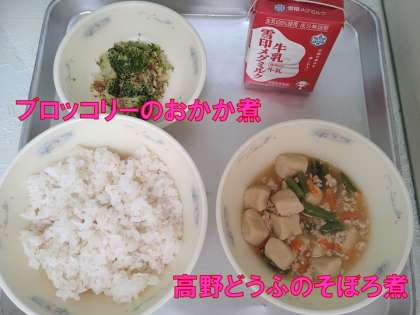 今日の献立は、「麦ごはん・牛乳・高野どうふのそぼろ煮・ブロッコリーのおかか煮」でした。