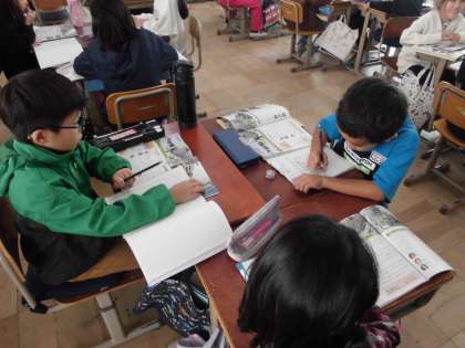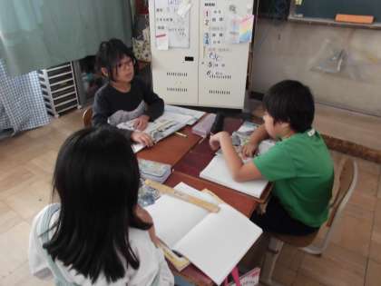 社会科『市のうつりかわり』の学習に取り組んでいます。70年前・50年前・今の写真を見比べて、変わった所や変わらない所をグループで話合いました。建物の違いや道路が砂利だったなど色々な意見がでました。