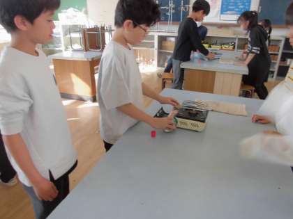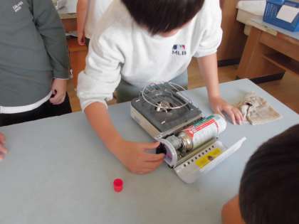 理科室にはたくさんの器具があり、いろいろな実験ができます。本格的な実験に入る前に理科室の使い方や器具の使い方を練習しました。今日は火を使うときの安全の確認や実際にカセットコンロを使って火をつけたり消したりする練習をしました。