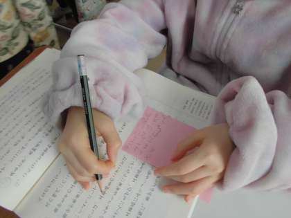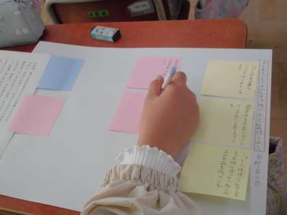 国語の学習では、文章を要約する学習をしています。今日は教科書の教材文「未来につなぐ工芸品」を読んで「はじめ」「中」「終わり」の文章のまとまりごとに中心となる語や文を見つけて付箋を使って整理しました。