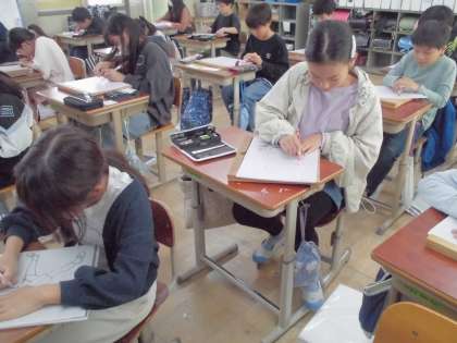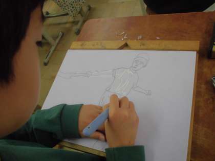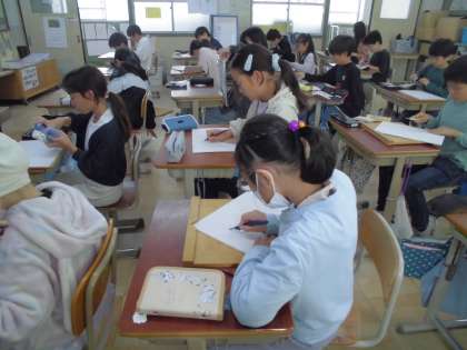 図工の版画の学習では、彫刻刀の使い方を練習した後、作品を彫り始めました。下絵の線に沿って、丸刀や三角刀などを使い分けながら彫り進めています。