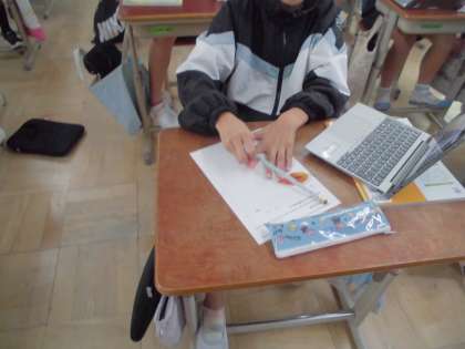 秋の植物の様子を観察しました。校門前の桜も、夏に比べると葉の数が少なくなり、赤く色づいていました。記録の写真を撮影して、観察カードにも書きました。