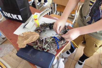 今日はリース作りをしました。拾ってきたどんぐりや葉っぱ、持たせていただいた飾りをつけてきれいに仕上げました。月曜日に持ち帰りますので、持ち帰り用の袋を持たせてあげてください。ぜひ、持ち帰ったらお家に飾ってあげてください。