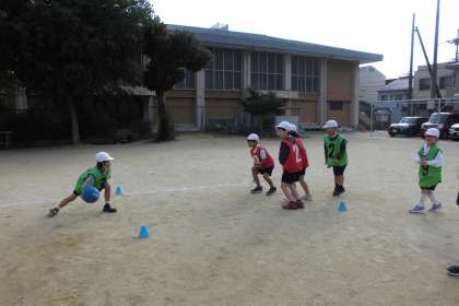 体育の学習で「ころがしドッチボール」に取り組んでいます。進んで準備や片づけをしています。また、ルールに慣れながらチームで楽しく活動することをがんばっています!
