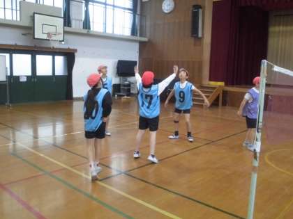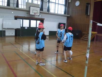 ソフトバレーボールの学習です。「体ならし」や「チームの時間」での会話や練習が上達のためによりよくなってきました。