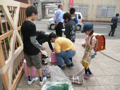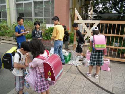 今年度初めての「環境の日」。朝早くからやってきた自然いっぱい委員会の子どもたちが張り切って準備をしてくれた甲斐あって,たくさんの牛乳パックやペットボトルのキャップ,使用済み乾電池などが集まりました。