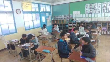 冬休みに取り組んだ自習学習の内容を交流しています。