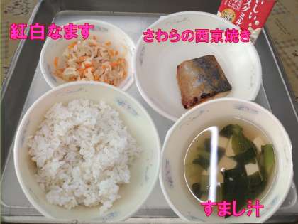 今日の献立は、「麦ごはん・牛乳・さわらの西京焼き・紅白なます・すまし汁」でした。