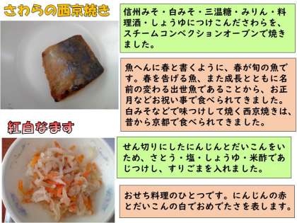 西京焼きは、白みそをつけて焼いた料理です。今日は、さわらを信州みそ・白みそ・三温糖・みりん・料理酒・しょうゆにつけこんでスチームコンベクションオーブンで焼きました。ほんのり甘味のあるみその味がしみて、ごはんによくあいます。子どもたちにも大好評でした。