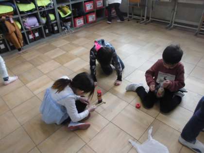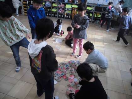 生活科の学習で「昔あそび」をしました。こままわし・めんこ・けん玉・だるま落とし・羽子板など、いろいろな昔あそびを友だちと仲良く楽しんでいました。