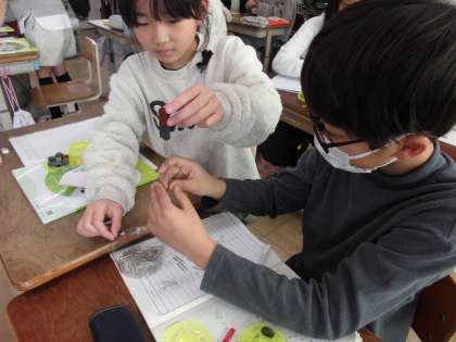 理科で「じしゃくのふしぎ」の学習をしています。今日はじしゃくにいくつクリップがつくのか実験をしました。クリップを一つ一つつけて最高は8個クリップがつきました。次の時間はなぜクリップがじしゃくにつくのか学習をします。