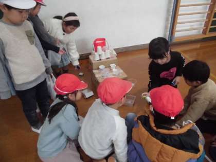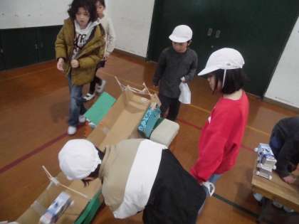 2年生が「わくわくおもちゃランド」へ招待してくれました。「わなげ」や「まとあて」などなど、色々な遊びコーナーで楽しく遊びました。折り紙の景品をもらい「見て見て、しゅりけんをもらったよ。」と大喜びでした。