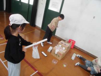 箱やペットボトルなどを使い、みんなが楽しめるおもちゃを作ってきました。1年生に分かりやすく、楽しんでもらうために、ルールも話し合って考えました。どの遊びも1年生に楽しんでもらうことができて、大成功に終わりました!