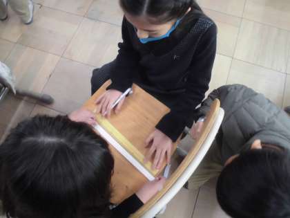 1学期は30cmものさしを使えば測れていた長さでしたが、机の縦の長さや、両手を広げた長さはどうすれば測れるかを考えました。両手を広げた長さは、紙テープで切って実際に調べてみました。グループで協力して、ものさしを並べたり、測ったところに印をつけたりと、工夫して長さを測っていました。