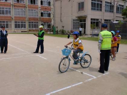 今日は、自転車教室でした。日常生活の中で自転車をよく乗る人もいればそうでない人もいましたが、自転車を乗るときのルールやマナー、道路標識などを学び、初めて知ることも多かったようです。PTAの役員さんを始め、多くの方にお手伝いしていただき、励ましの声をたくさんかけてもらいました。子どもたちも、暑い中よくがんばりました。