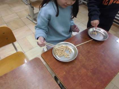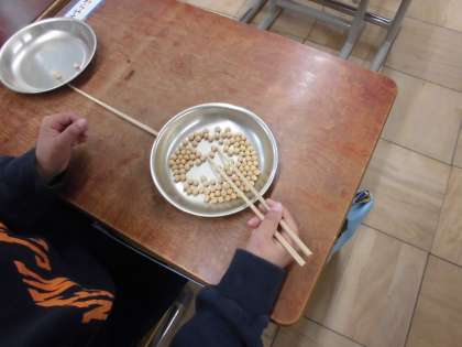 今週は「給食週間」です。お箸の正しい持ち方を練習しました。取組の一つに「豆つまみ大会」があり、30秒でいくつの豆をつまめるかをクラスで競いました。「豆がつるつるしていてつまむのがむずかしい。」「正しい持ち方だと、しっかり豆をはさめるね。」と、お箸の正しい持ち方の良さを感じていました。