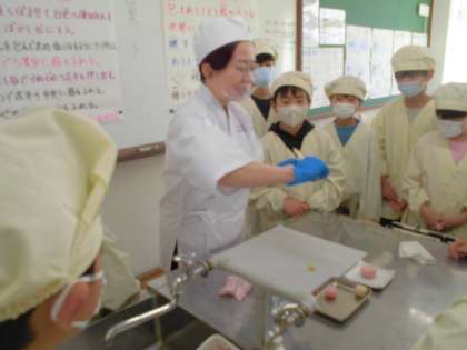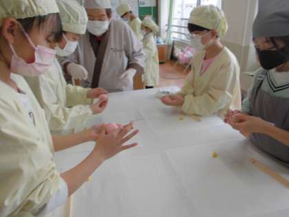 和菓子体験がありました。みんなこの日を楽しみにしていました。まず、これからの季節にぴったりの桜の和菓子を作りました。一つ一つ丁寧に教えていただきながら、初めて作った和菓子。餡を包んだり、花びらの形を作ったりと、楽しみながら作りました。