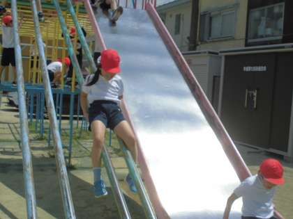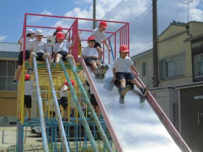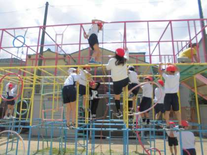 体育の学習で遊具の使い方を練習しました。3年生は一番上の階まで登れて滑り台ができます。早速、楽しそうに滑り台を楽しんでいました。