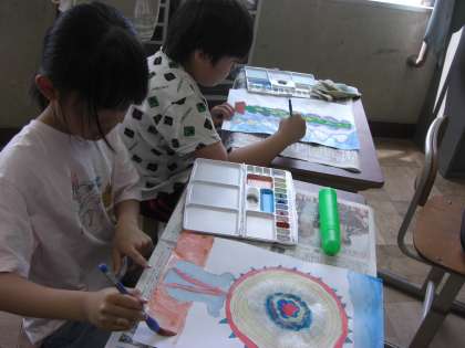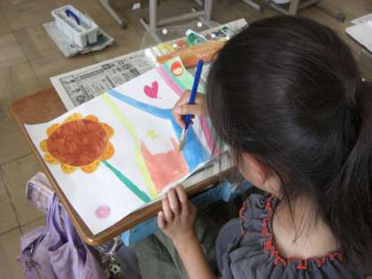図画工作の「まぼろしの花」の学習の様子です。誰も見たことのないまぼろしの花を想像して、自分だけの花を咲かせています。花の世界を想像して、どう表そうかを考えながら描いていました。