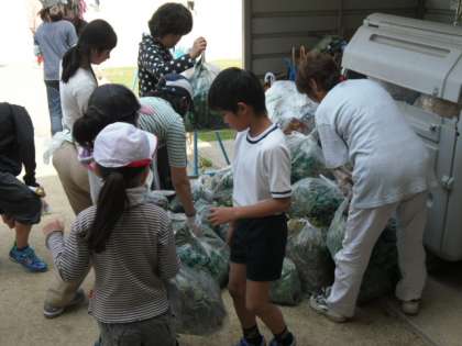 時間が来ると,引いた草がぞくぞくと集まってきました。運動場も芝生広場もすっきりです。